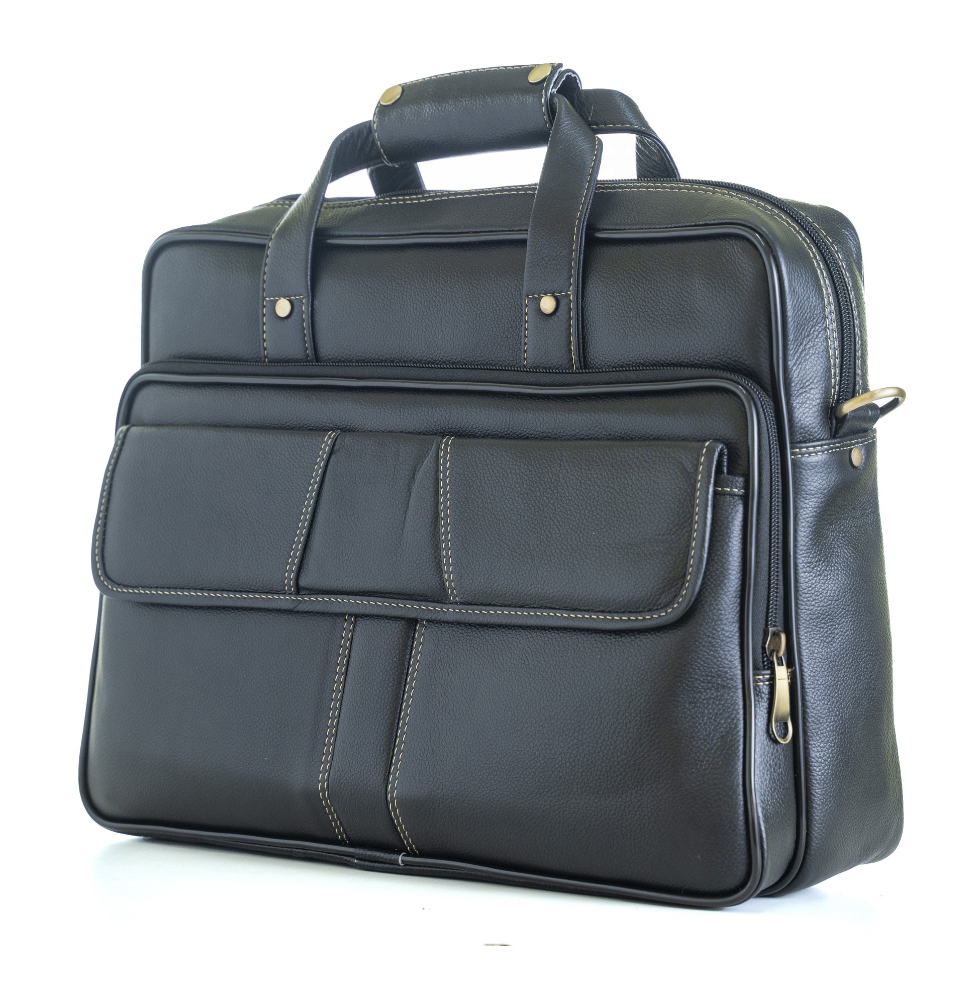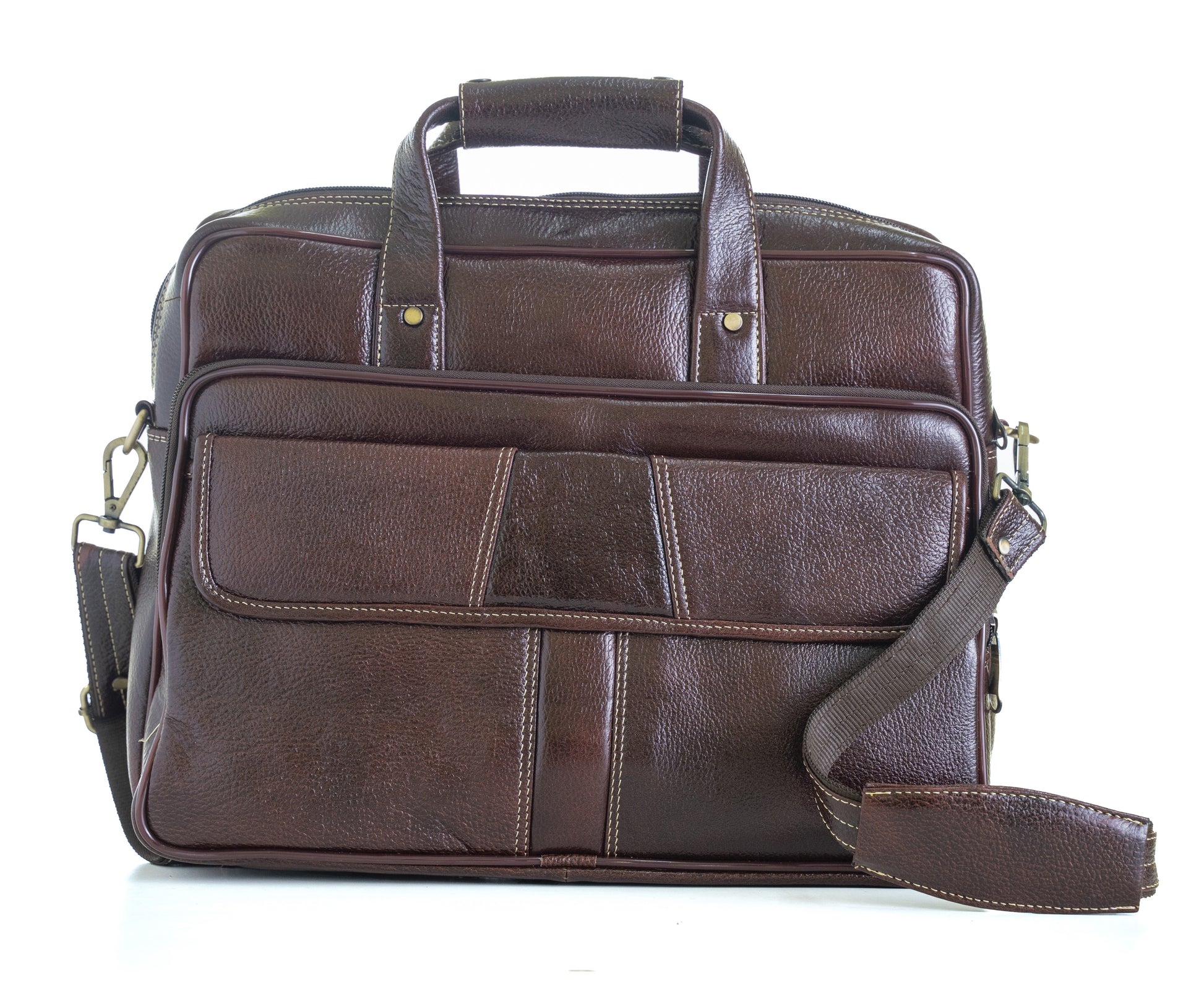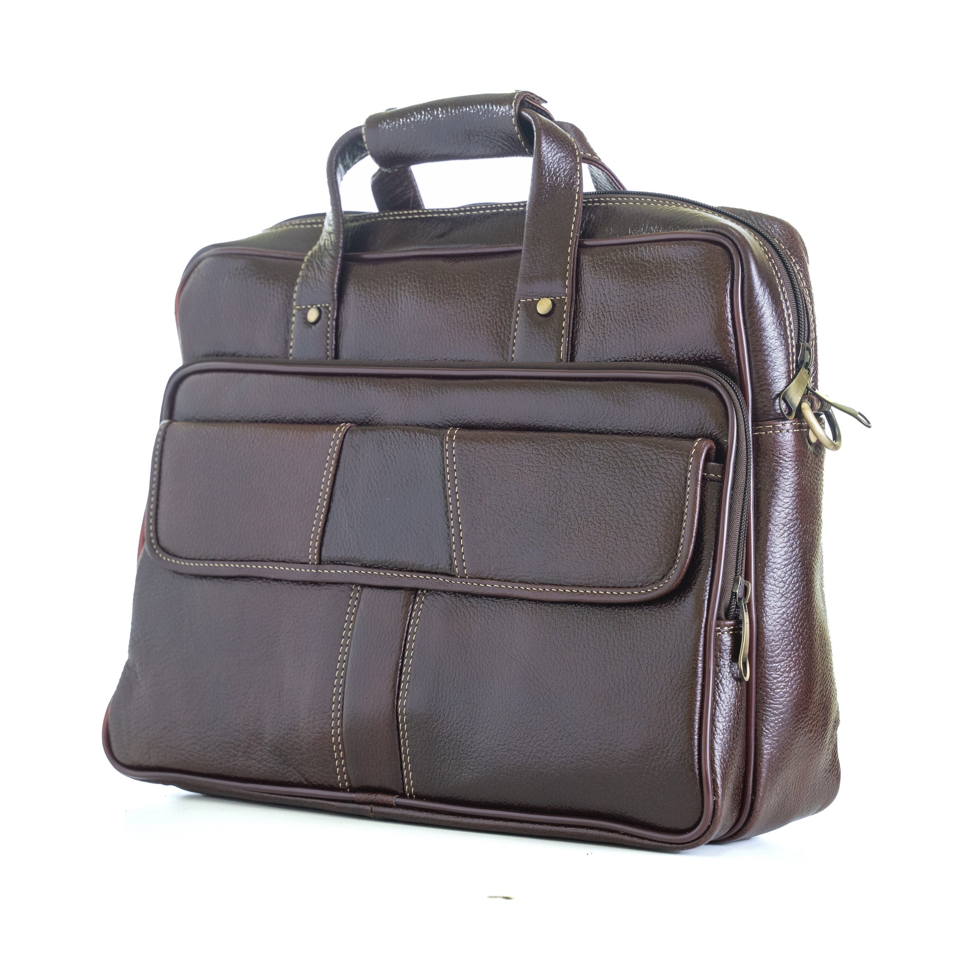 Elevate your professional style with this sophisticated brown leather handbag that seamlessly blends functionality with elegance. Crafted from premium leather, this versatile bag features multiple compartments including a spacious main section and thoughtfully designed external pockets with secure zip closures. The bag's distinctive contrast stitching and brass-toned hardware add refined details to its classic design. Perfect for daily office use, it comes with both sturdy top handles and an adjustable shoulder strap for comfortable carrying options. The practical front organiser pocket keeps your essentials within easy reach, while the durable construction ensures this bag maintains its shape and finish through regular use. Its rich brown colour and timeless silhouette make it an ideal companion for business meetings, daily commutes, or carrying your laptop and documents in style.
