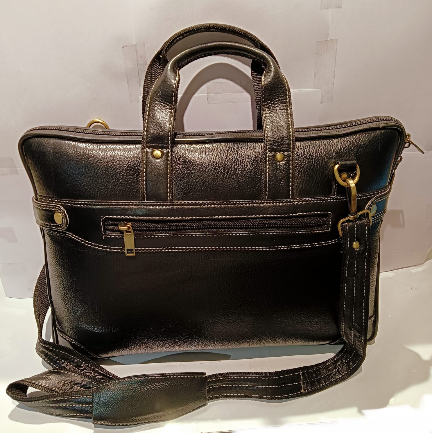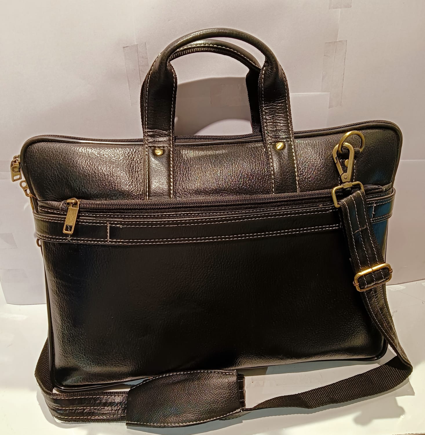 Elevate your professional image with this sophisticated black leather briefcase, meticulously crafted with attention to every detail. The premium leather construction features elegant contrast stitching that adds a refined touch while reinforcing durability. This versatile business companion offers multiple organisation options, including a spacious main compartment and a convenient exterior zippered pocket secured with quality brass hardware. The thoughtfully designed dual carrying options include sturdy leather handles and an adjustable shoulder strap for comfortable transport. The classic silhouette is enhanced by brass accents and sturdy metal zips that ensure smooth operation. Perfect for daily office use, this briefcase provides ample space for your laptop, documents, and business essentials while maintaining a sleek, professional appearance. The robust construction and timeless design make this briefcase an excellent investment for the discerning professional who values both style and functionality.