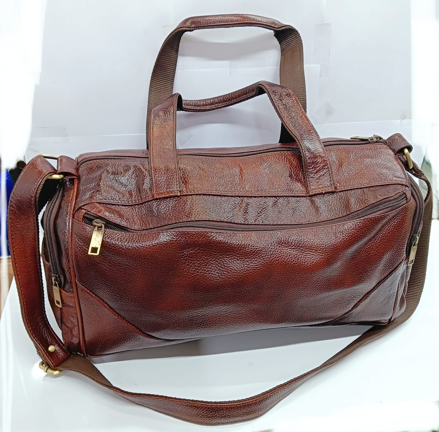 Elevate your travel style with this sophisticated brown leather duffle bag. Crafted from premium leather that develops a rich patina over time, this versatile bag features multiple compartments for organised storage of your essentials. The thoughtfully designed structure includes both top handles and an adjustable shoulder strap, offering convenient carrying options for your comfort. Secured with sturdy brass-toned zippers, the bag provides easy access to your belongings while maintaining their safety. Perfect for weekend getaways, gym sessions, or business trips, this duffle combines classic aesthetics with practical functionality. The spacious main compartment and additional zippered pockets help keep your items neatly sorted. The robust leather construction ensures durability, while the timeless design makes it a sophisticated choice for both casual and formal settings. This duffle bag stands as an ideal companion for the modern traveller who values both style and utility.