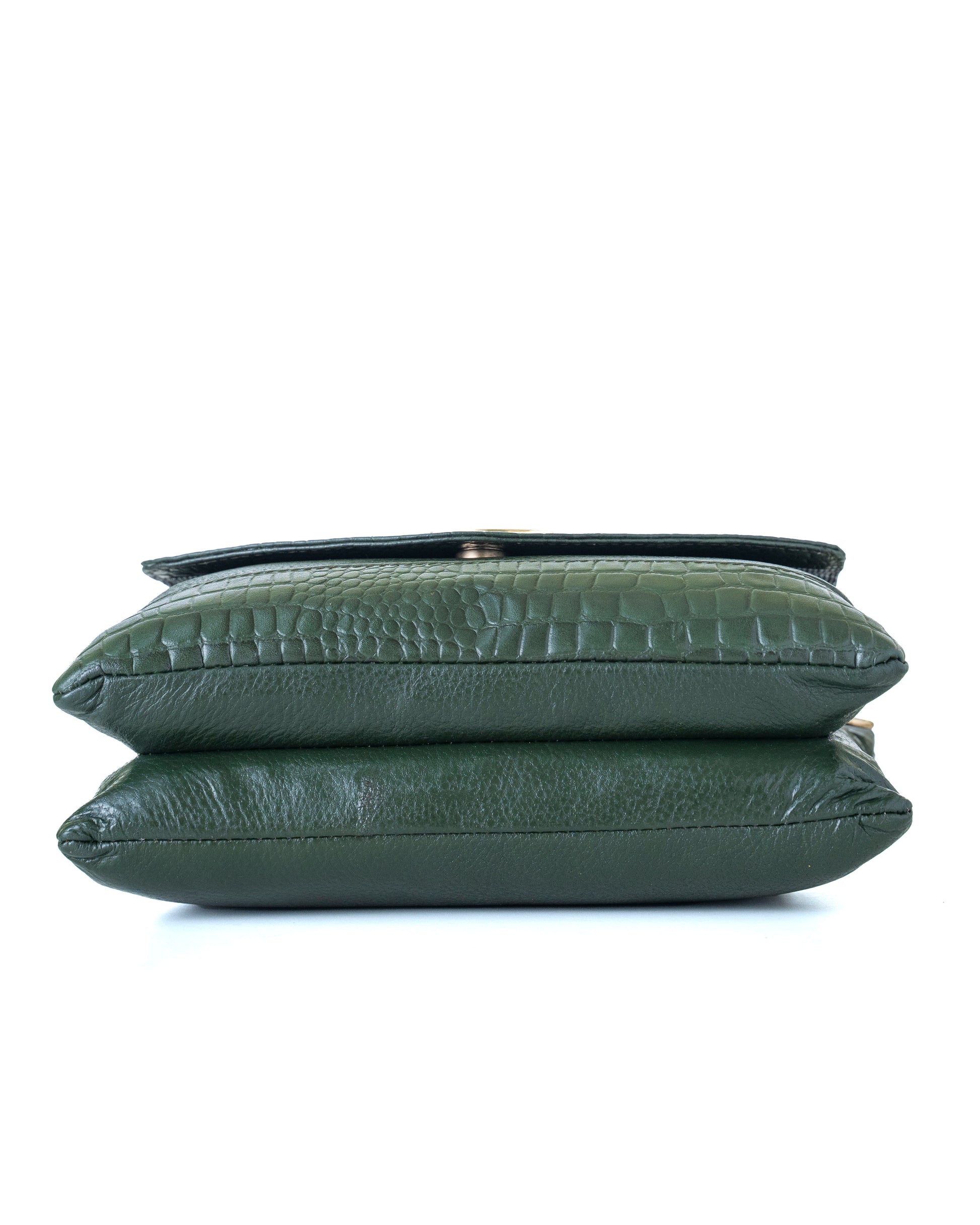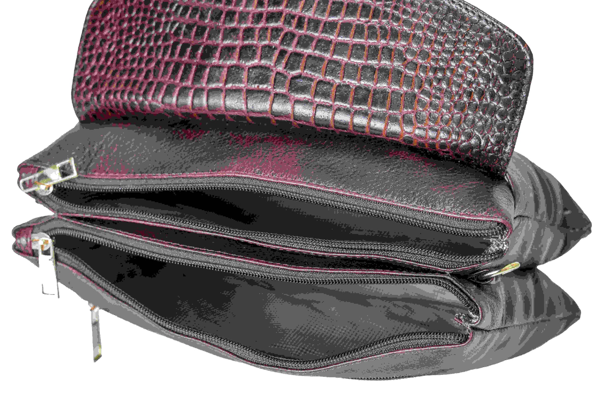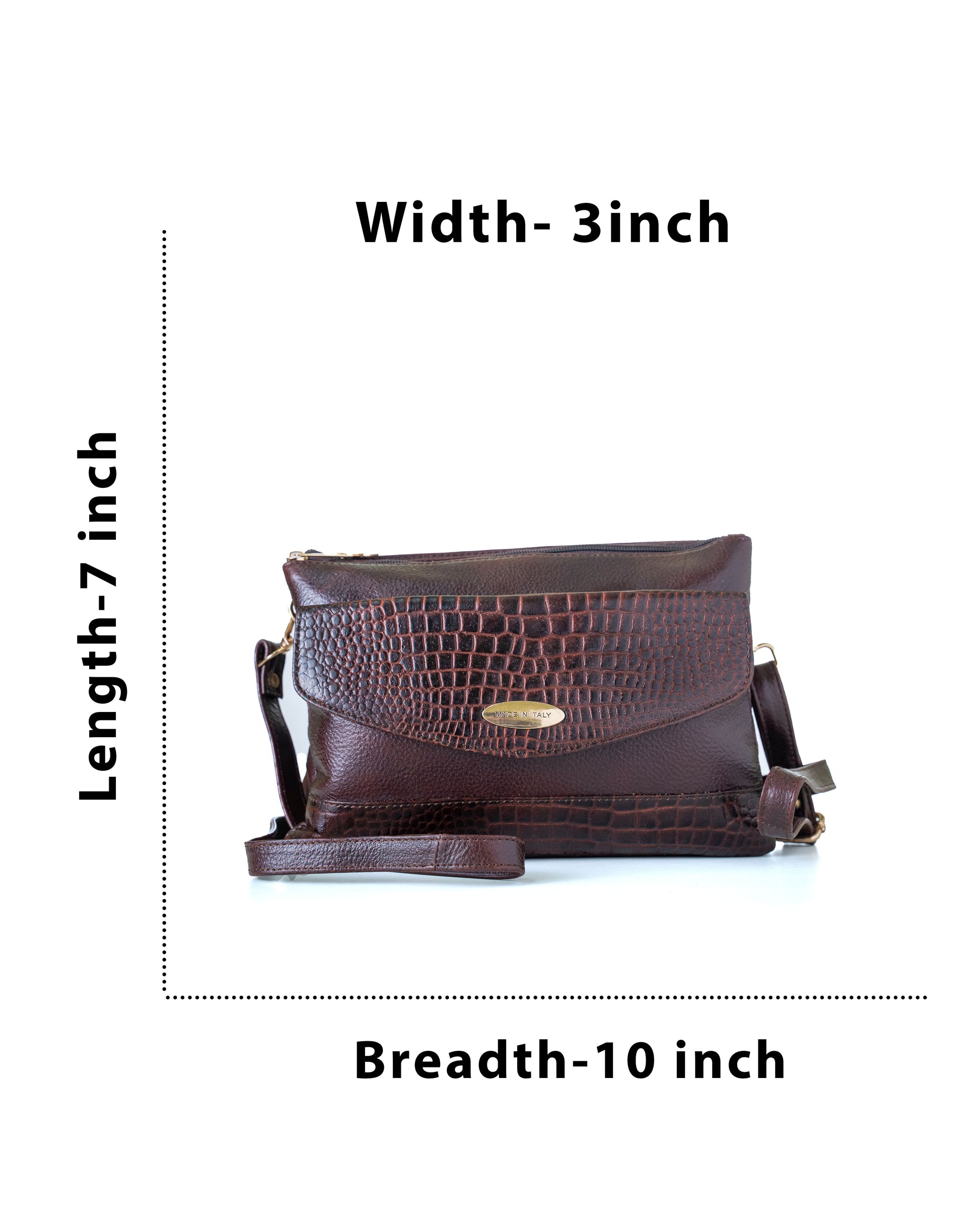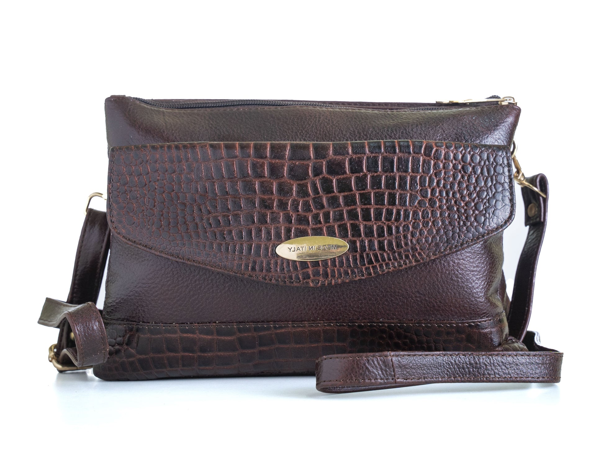 Elevate your accessory collection with this exquisite Italian leather crossbody bag. The rich brown leather features sophisticated croc-embossed detailing that adds a luxurious texture to the design. Crafted with meticulous attention to detail, this bag showcases elegant gold-tone hardware that perfectly complements its classic silhouette. The adjustable shoulder strap ensures comfortable wear, while multiple compartments, including a secure zip pocket, keep your essentials organised. The main compartment offers ample space for daily necessities, and the smooth leather back panel provides a sleek finish. This versatile bag seamlessly transitions from day to evening wear, making it an ideal companion for various occasions. The premium leather construction promises durability while maintaining its sophisticated appearance. Perfect for the fashion-conscious individual who appreciates timeless Italian craftsmanship and practical elegance.