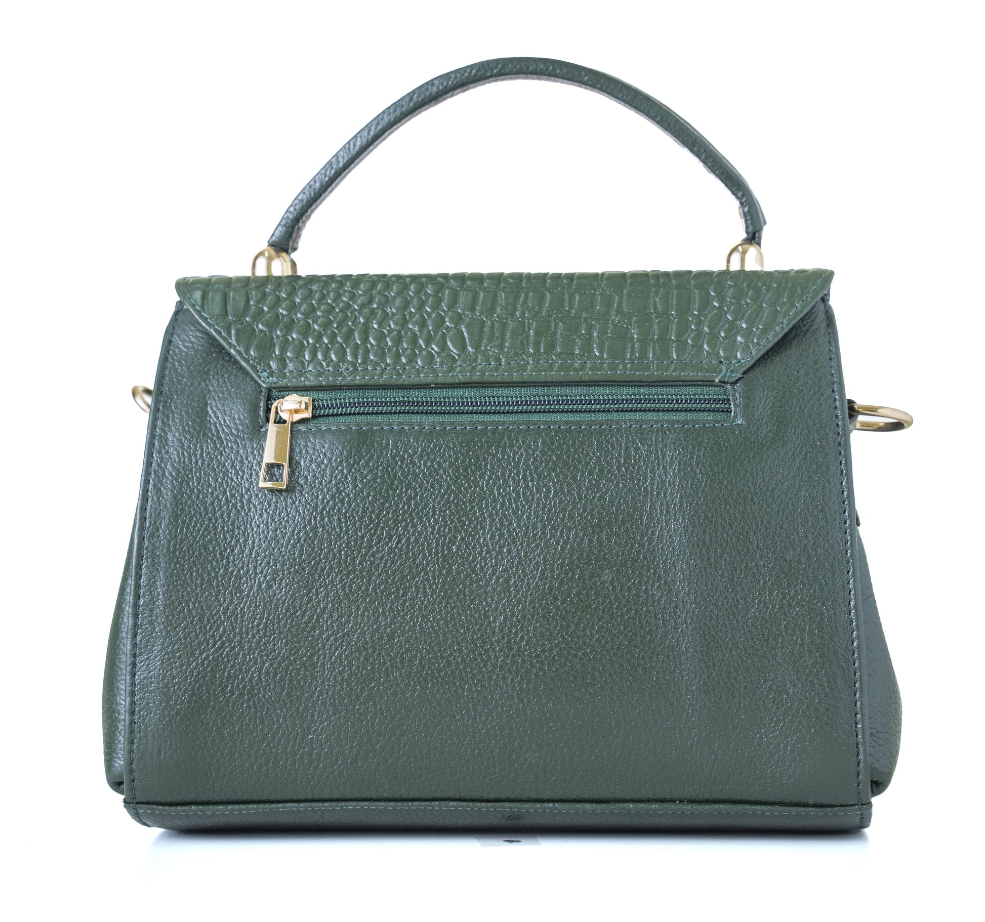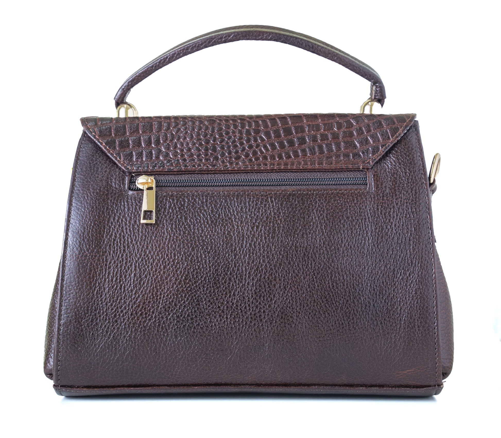 Elevate your style with this sophisticated brown leather handbag featuring an elegant crocodile pattern on the flap. This versatile accessory combines classic design with practical functionality, showcasing premium gold-tone hardware accents. The thoughtfully designed structure includes both a sturdy top handle and an adjustable shoulder strap, offering multiple carrying options to suit your preference. The textured leather exterior exudes luxury while providing durability for everyday use. A sleek metallic bar adorns the flap closure, adding a contemporary touch to the traditional silhouette. The bag's practical features include a secure zip pocket on the back, perfect for keeping essential items within easy reach. Its medium size makes it ideal for both daily errands and special occasions, while the rich brown colour ensures it complements any outfit. The refined craftsmanship is evident in every detail, from the precise stitching to the carefully finished edges.